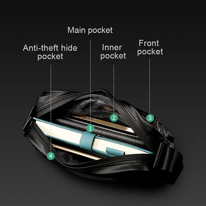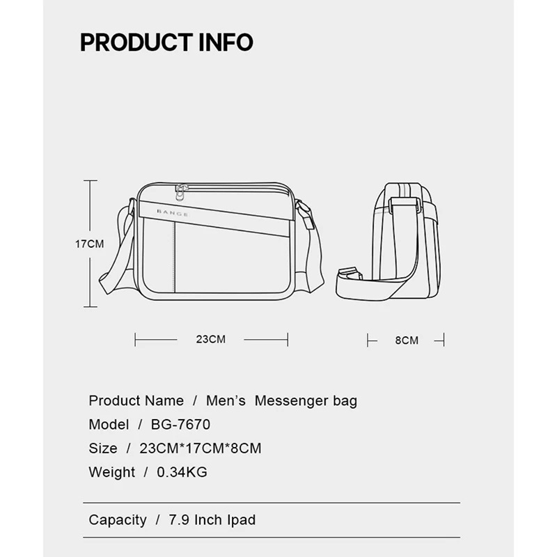 بنج BG-7670 با اندازه 23×8×12 سانتی متر دارای یک محفظه اصلی و بزرگ بوده با جیب های جداگانه و یک جیب زیپدار داخل بوده که می تواند تمامی لوازم شما را در خود جای دهد. به راحتی لوازم ضروری خود اعم از آیپد، گوشی همراه، کیف پول، پاوربانک، گذر نامه، چتر، عینک و ... را درون کیف قرار دهید و نگران کمبود جا نباشید.