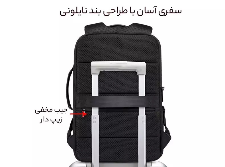 قسمت پشتی نیز یک کمربند نایلونی تعبیه شده است که به لطف آن می توانید کوله پشتی را روی دسته کیف پرواز قرار دهید و مسیر سفر را برای خود آسان و لذت بخش نمایید.
