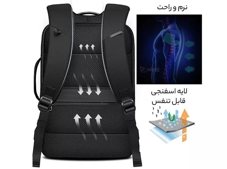 پشت کوله پشتی و بندهای شانه ای پهن با اسفنج های قابل تنفس پوشانده شده تا کوله پشتی برای استفاده نرم و راحت باشد و از تعریق جلوگیری نماید. سیستم تهویه مانع از تعریق شده و از گرفتگی عضلات کمر و شانه جلوگیری می کند. به علاوه از بو جلوگیری می کند و عرق را جذب می نماید. طراحی ارگونومیک در پشتی این کوله موجب شده تا استفاده دراز مدت شما را خسته نکند.