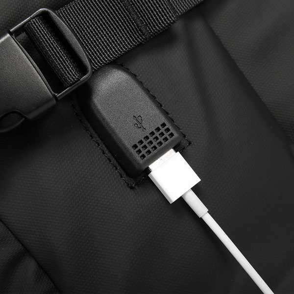 در طراحی کوله پشتی ضد آب بنج مدل BG-7690 پورت USB میبینید که برای شارژ کردن موبایل یا هر دستگاه دیگری قابل استفاده است که در قسمت خارجی کیف در سمت چپ قرار دارد که از شارژ سریع پشتیبانی میکند.