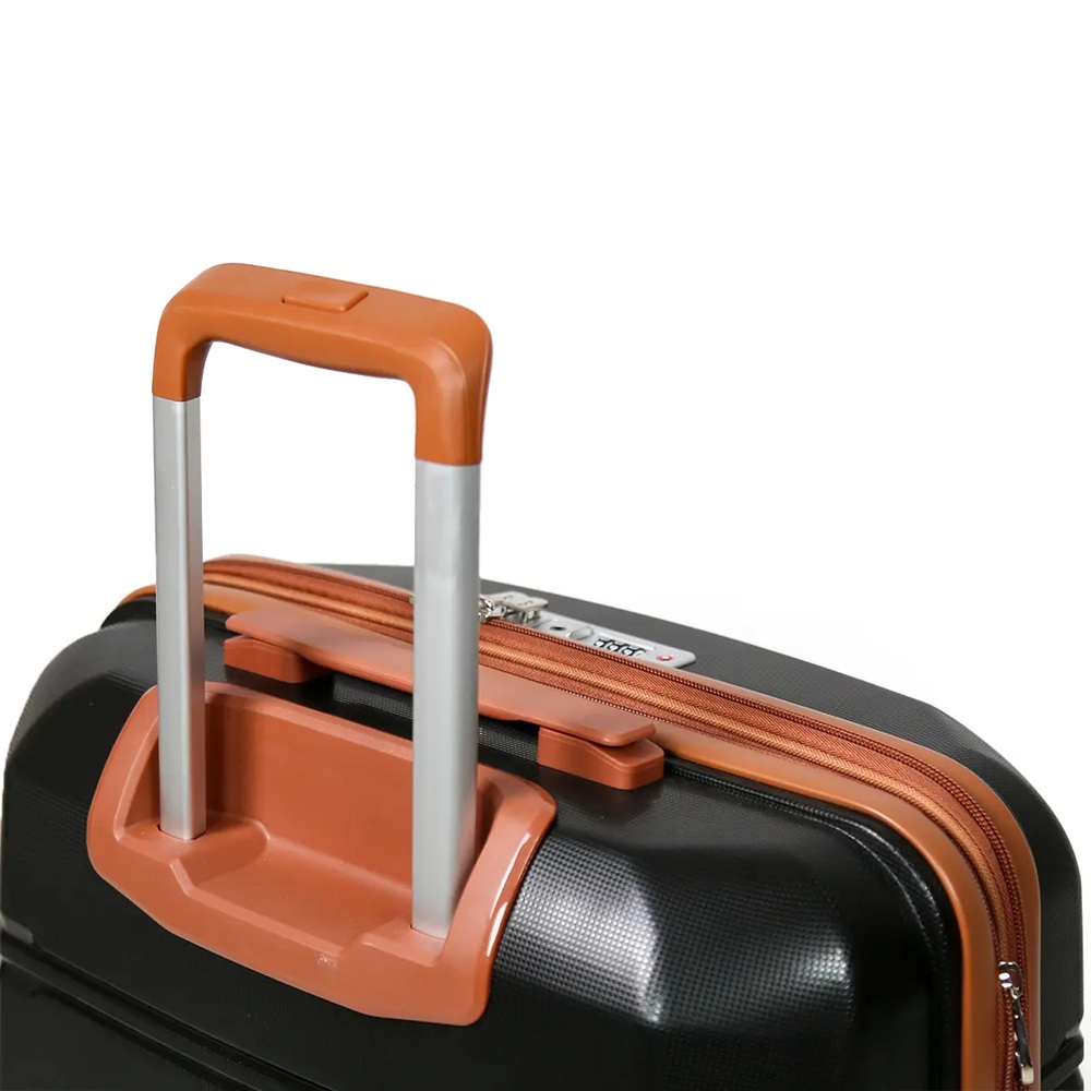 دسته تلسکوپی چمدان از جنس آلومینیوم سبک و ضدزنگ ساخته شده که در برابر ضربه و فشار مقاوم است. امکان تنظیم ارتفاع در چندین سطح و طراحی ارگونومیک آن، حمل چمدان را راحتتر کرده و از ایجاد فشار اضافی به دست جلوگیری میکند.