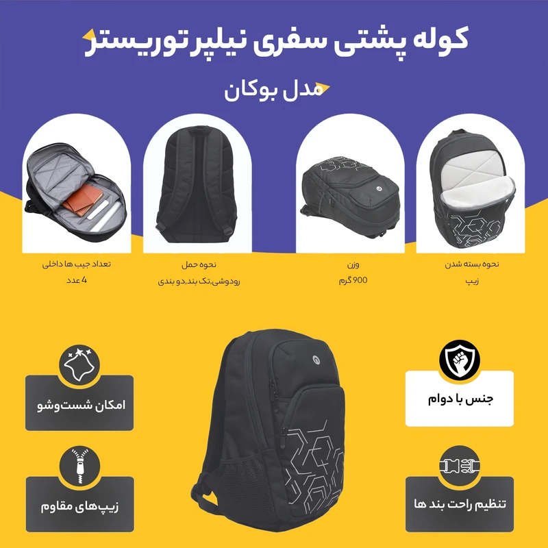 معرفی : کولهپشتی بوکان محصولی جوان پسند اسـت کـه بـا توجـه بـه نیـاز دانشـجوها، دانشآمـوزان و بطور کلی افراد جـوان و نوجـوان طراحـی شـده اسـت. داشـتن یـک کولـه لپتـاپ بـا ویژگیهـا و ارگونومـی مناسـب میتواند حمل وسـایل مـورد نیاز را برای افراد تسهیل کند. حجـم، وزن و ابعـاد مناسـب ایـن کولـه، آن را بـرای سـفرهای درون شـهری، دوچرخـهسـواری و استفاده از حمل و نقل عمومی مناسـب میکنـد. همچنیـن طراحـی زیبـای محصول بـا گــوشههای گـرد و ارگونومیک خود مقاومت بسیار کمی را در مقابـل جریـان هوا ایجاد میکند.محفظـه جلویـی بـا بافـت پارچـهای نرم، مانـع آسـیب رسـیدن بـه وسـایل حسـاس و آسـیبپذیر میشـود. بنابراین این بخش از کوله پشتی، بـرای قـراردادن وسـایلی نظیـر تلفـن همـراه، عینـک، زیورآلات و غیره مناسب می باشد. محفظـه متوسـط جلویی مناسـب نظم دادن بـه وسـایل کوچـک مثـل پاوربانک، لوازم آرایش، USB، کلیـد و سـوئیچ، خودکار، لوازم التحریر و سـایر موارد مشابه میباشد.