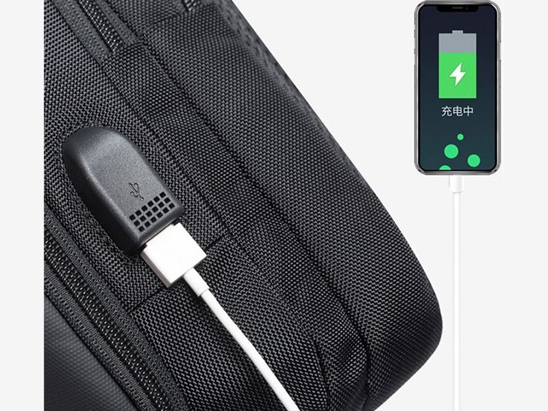 در طراحی کوله پشتی ضد آب بنج مدل BG-7079 پورت USB میبینید که برای شارژ کردن موبایل یا هر دستگاه دیگری قابل استفاده است که در قسمت خارجی کیف در سمت چپ قرار دارد. تلفن خود را در دو مرحله آسان شارژ کنید: